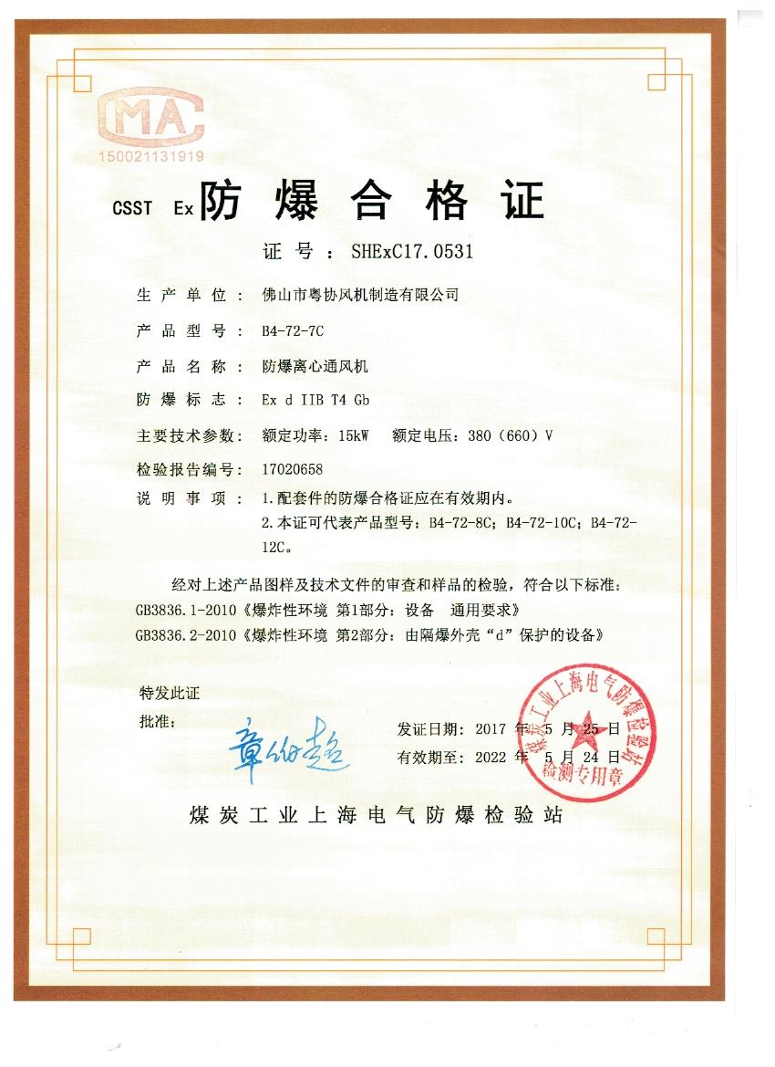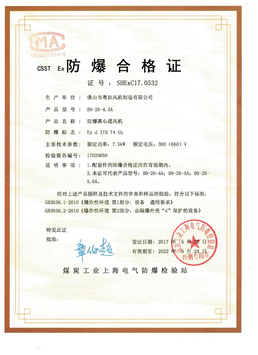 好消息!佛山粵協(xié)風(fēng)機(jī)廠家生產(chǎn)的防爆離心通風(fēng)機(jī),高壓防爆離心通風(fēng)機(jī),獲得防爆證書(shū)。本證可代表產(chǎn)品型號(hào):B4-72-8C、B4-72-10C、B4-72-12C。 B9-26-4A、B9-26-5A、B9-26-5.6A。表示粵協(xié)風(fēng)機(jī)廠家的防爆離心通風(fēng)機(jī)產(chǎn)品質(zhì)量符合國(guó)家相關(guān)規(guī)定,穩(wěn)定性、可靠性。