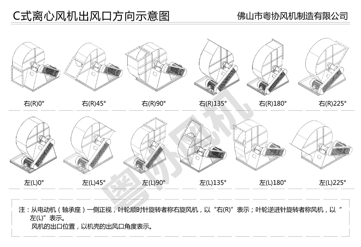 離心風機的出口位置,以機殼的出風口角度表示。4-72A型離心風機№3~6在出廠時均做成一種型式:出風口位置調整范圍0°~255°,間隔是45°,傳動方式為A式傳動;№7~12的出風口位置制成固定的三種:0°、90°、180°,不能調整;№7~12的傳動方式為C式傳動。訂貨時需注明。